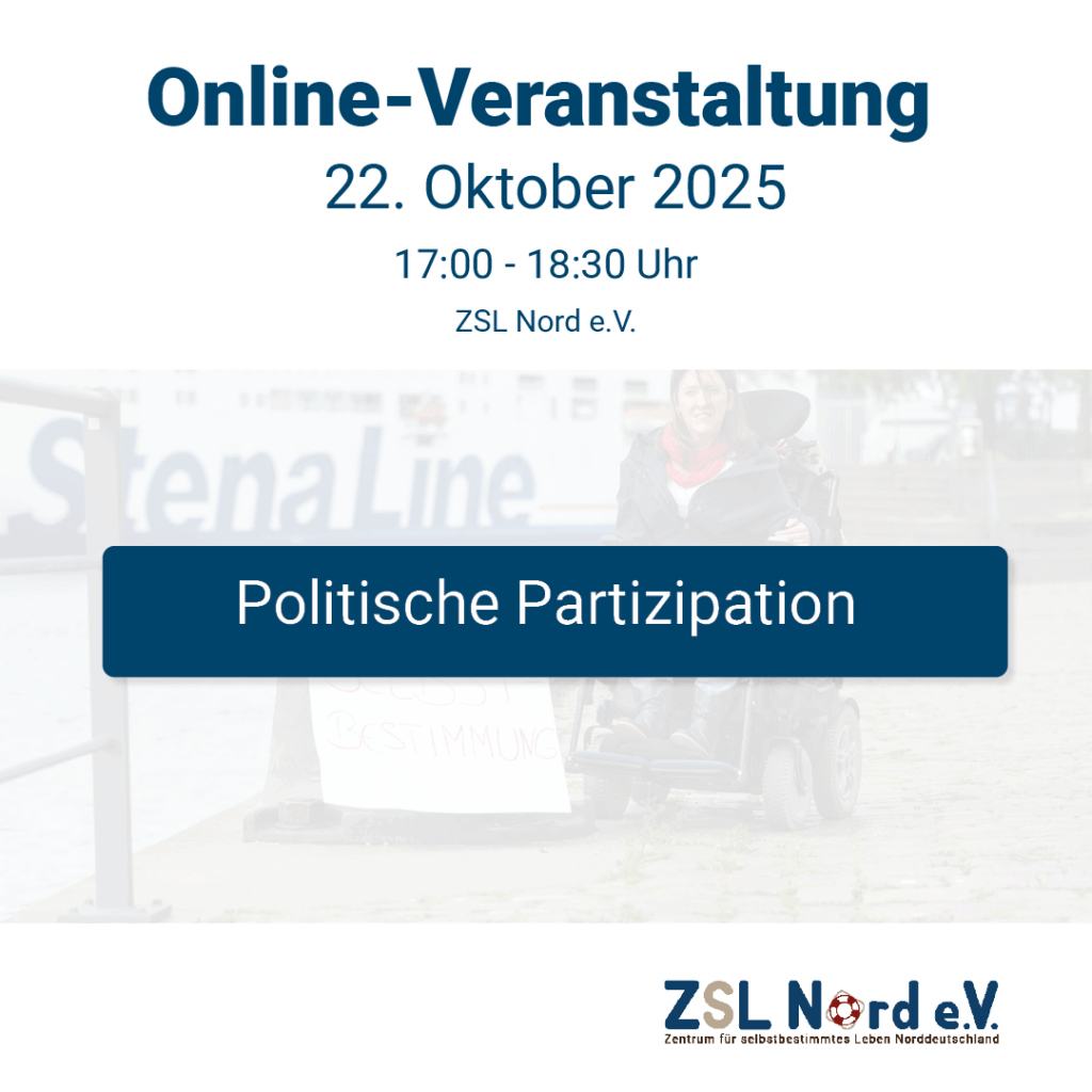 politische Partizipation ist ein Menschenrecht – und dennoch längst keine Selbstverständlichkeit. Deshalb möchten wir, die AG Politik des Zentrums für selbstbestimmtes Leben Norddeutschland e.V. (ZSL Nord), Sie ganz herzlich zu einer besonderen Online-Veranstaltung einladen: